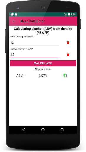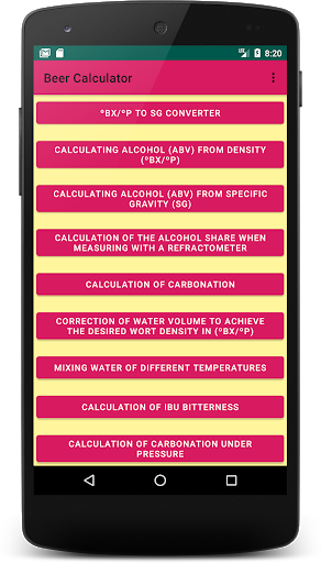 The app contains a set of calculators to help you make calculations in home brewing. Following calculators are available: