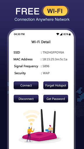 Wifi Free Connection Anywhere is the best Wi-Fi scanner, manager. When you look at current wifi connection, you will see some of the information mentioned above, but also IP address of your device, MAC address, and link speed network .