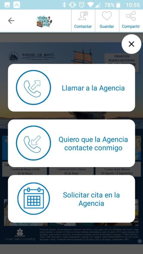 Una amplia selección de ofertas de viajes de último minuto, puentes, cruceros, circuitos, y muchas más. Con su sólo gesto podrás guardar como favorita una oferta, compartirla por WhatsApp, e-mail, etc y solicitar que un agente te llame o llamarnos directamente