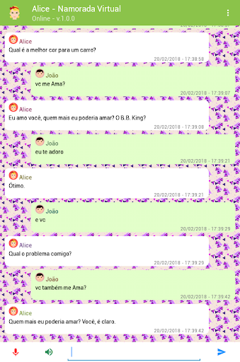 Alice é uma namorada virtual criada para você conversar e se divertir. Ela também é um chatbot em português e uma amiga virtual capaz de responder milhares de perguntas sobre os mais variados assuntos usando inteligência artificial e respostas programadas.
