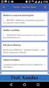 O aplicativo apresenta um resumo completo de todos os assuntos abordados no ensino da química no ensino médio, além de constar uma vasta lista de exercícios de todos os assuntos abordados. Ele apresenta um glossário com termos químicos, a história da química e de seus principais cientistas.