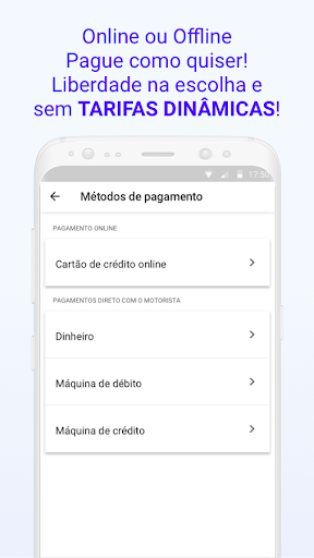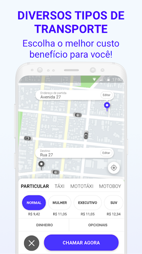 - O app irá mostrar o preço estimado para cada uma dos tipos e categorias de transportes (carro particular, táxi ou mototáxi). Selecione como irá pagar (dinheiro, máquina de cartão ou cartão de crédito online);