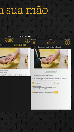 Nós sabemos o quanto pode ser trabalhosa a gestão de convidados do seu evento, festa ou casamento e estamos aqui para te ajudar nisso! Com o nosso aplicativo, você pode criar seu evento, enviar convites virtuais para as pessoas e receber a confirmação de presença. Isso te ajuda no planejamento do evento e evita desperdício, auxiliando no controle de buffet, por exemplo.
