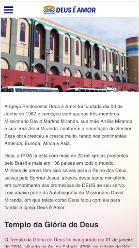 Tenha a rádio Deus é Amor, da Igreja Pentecostal Deus é Amor, no seu celular e confira a nossa programação em qualquer lugar do mundo. Tem as nossas mídias sociais, programas pra ouvir a qualquer momento, testemunhos, oração e muito mais. A voz da libertação cruzando fronteiras e levando o ide de Jesus. Igreja Pentecostal Deus é Amor.