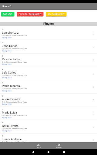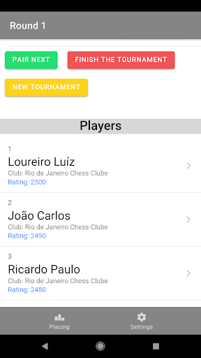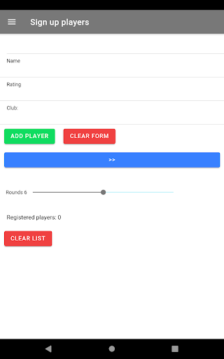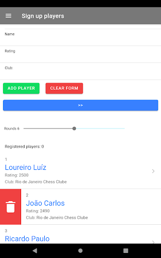 Add players to the tournament and set the number of rounds, you must have at least 9 players to start the tournament, you can delete players from the subscribers list by sliding the item to the right.
