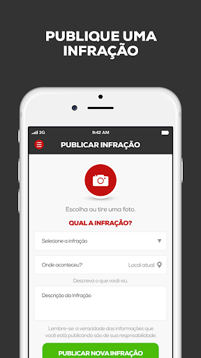 Com o Na Rua App, você pode publicar infrações de trânsito de onde estiver. Poste a foto e o local onde foi sinalizada a infração. A cada infração você acumula pontos e pode ganhar prêmios!