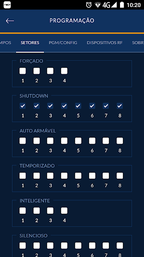 Já pode monitorar o status de 8 setores individualmente (4 hibridos 4 sem fio), com possibilidade de nomea-los e verificar: