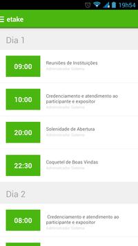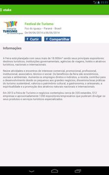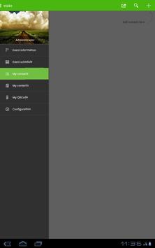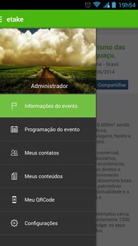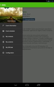 A solução etake tem como objetivo realizar a transferência de informações de um evento, de forma sustentável e ecológica. Cartão de visitas dos participantes, folders e propagandas dos estandes, poderão ser transferidos de forma digital e interativa para os participantes e expositores de um evento. O uso do etake é viabilizado através de parcerias entre organizadores de eventos e expositores, permitindo assim aos participantes uma experiência digital, prática e ecologicamente correta.