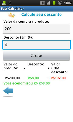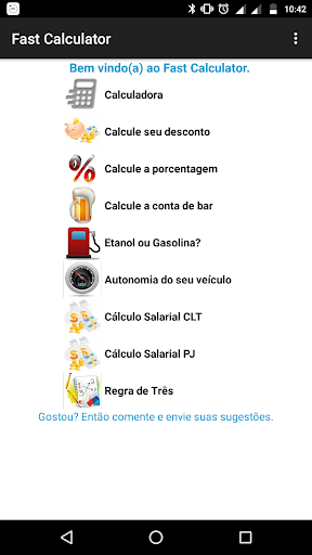 Fast Calculator is an application that aims to assist its users in a variety of calculations commonly used in everyday life, such as calculations of discounts, percentages, calculating to see what the most advantageous to supply fuel, salary calculation and soon many others.