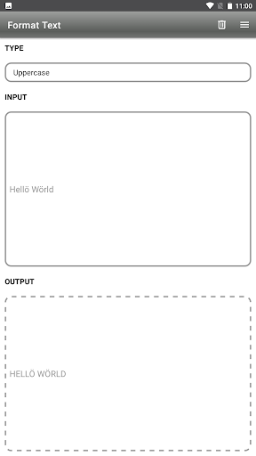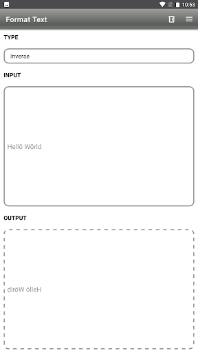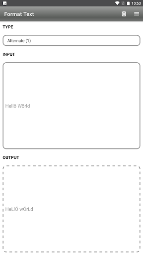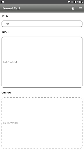 The application allows you to format (alternate, upside down/up, inverse, uppercase, lowercase, no accents, sentence, title) input content simply and quickly. You can open a document (txt) as input and copy the input or output content from the options menu.