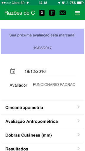 3- Avaliação: O aluno poderá visualizar suas avaliações físicas no Aplicativo.