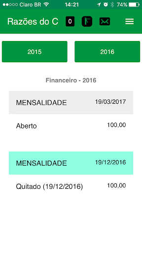 4- Financeiro: O aluno poderá verificar os valores pagos no ano atual e anterior, além de todas as mensalidades em aberto.
