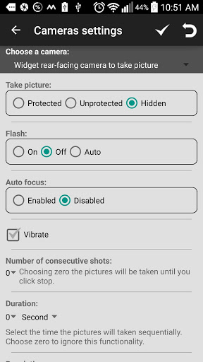 - Setting up Flash, rear and front camera, auto focus and vibration.