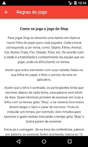 Basicamente, para jogar stop as pessoas se reúnem, determinam diferentes categorias como Nome, Fruta, Carro, etc, e sorteiam uma letra do alfabeto. Sorteada a letra, o jogo começa. Para cada tema, os jogadores devem encontrar uma palavra que comece com a letra sorteada."