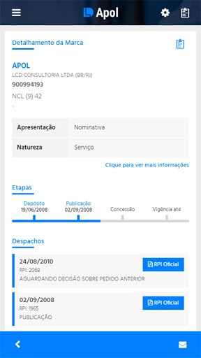 - Consultar detalhes dos seus processos de PI: marcas nacionais, patentes nacionais e Desenhos industriais.