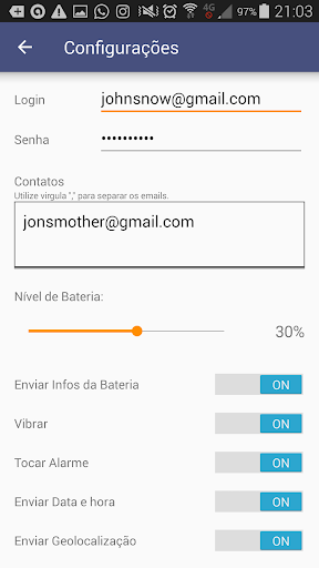 - Configure seu email corretamente para o aplicativo poder enviar suas notificações, o aplicativo continuará te notificando com alarme e vibração normalmente caso não tenha configurações de email válidas.