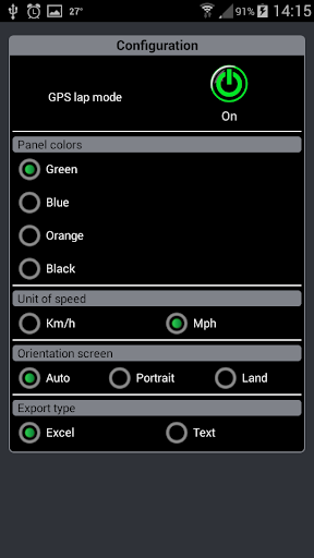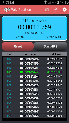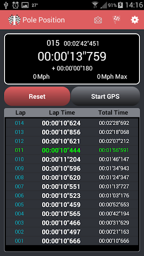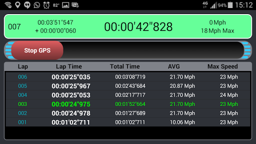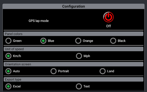 For get the lap register in GPS mode, you need set the finish line in application. After that you need only set the GPS mode to on and start the clock. Every time you pass on the line with the cellphone, the application get the lap time of the moment and triggers the next lap. In GPS mode is possible to get the speed, top speed, average speed lap and the best lap too.