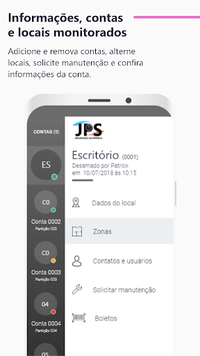 Met JPS Mobile kunt u met uw alarmpaneel direct op uw smartphone communiceren.Hiermee kan de bewaakte client rechtstreeks via mobiele applicatie of tablet alle activiteiten van uw beveiligingssysteem vergezellen.Via de applicatie kunt u de status van het alarmpaneel weten, bevestig hem en ontwapen u, bekijk Live-camera's, controleer evenementen en open-serviceorders en het maken van telefoontjes voor geregistreerde contacten in uw profiel.Het is de beveiliging die je nodig hebt in de palm van je hand.