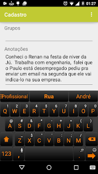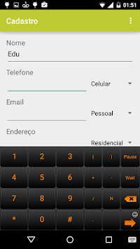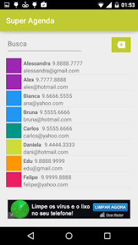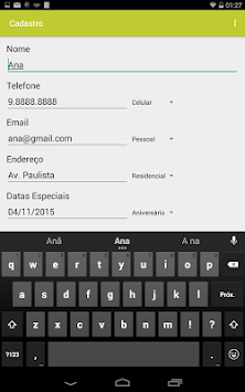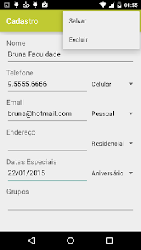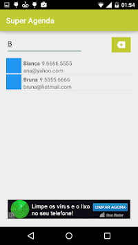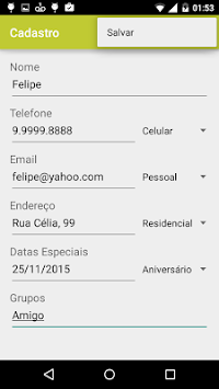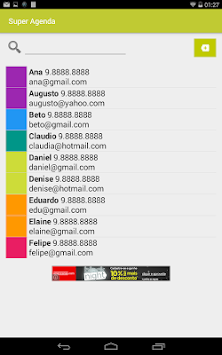 Simple contacts agenda, It allows saving name, phone, email, address, birthday, groups and annotations. Once saved, in the main screen is possible to display in a list name, phone and email of the contact.