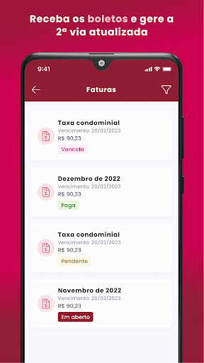 • FATURAS: Receba a taxa condominial pelo app e com 1 clique copie o código de barra para pagar em seu Internet Banking. Venceu? Sem problemas: gere a 2ª via e pague na hora! Chega de boletos em baixo na porta ou horas no telefone para gerar uma 2 via.