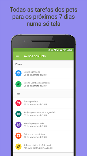 Para facilitar as tarefas de todos os pets agendadas para os próximos 7 dias, a partir da data atual, são exibidas em uma tela de avisos para que você possa se programar para não esquecer de nada, e caso esqueça, não se preocupe você será notificado.