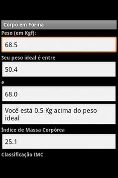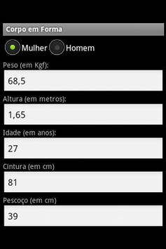 Corpo em Forma permite que você saiba quantas calorias deve consumir, quanto tempo levará para entrar em forma, qual é a taxa de gordura do seu corpo e outros dados para manter sua saúde.