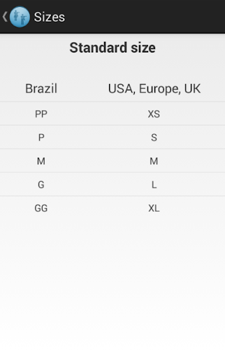 Size Guide has sizes available for Brazil, U.S.A., Europe and U.K.. You only need to choose the size of a country that the application will show the rest.