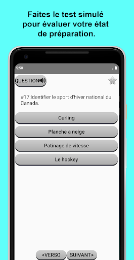 Grâce à cette application gratuite du test de citoyenneté canadienne, vous pouvez facilement vous préparer au test de citoyenneté au Canada. Pour devenir citoyen canadien, vous devrez passer le test de citoyenneté. Le test dure 30 minutes et contient 20 questions à choix multiples. Vous devez passer avec au moins 15 questions (75%) répondu correctement.