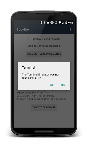 - In Terminal Emulator -> Preferences -> Initial command: "export PATH=$PATH:/data/data/burrows.apps.busybox/app_busybox/; export LD_LIBRARY_PATH=$LD_LIBRARY_PATH:/data/data/burrows.apps.busybox/app_busybox/"