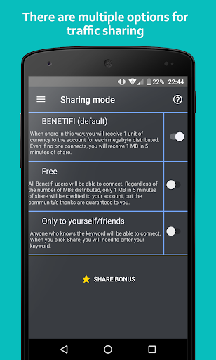 • “BENETIFI” option allows provides user with 1 point of currency for every megabyte shared. If he continues to share, he'll recieve additional bonuses after every 5 minutes.