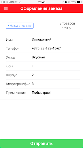 Удобно для одноразового заказа. Во второй раз обезоруживает то, что не запоминает адрес доставки и приходится вбивать руками каждый раз. Не сохраняет состояние корзины если приложение свернуто, а потом запущено из фона тапом по иконке. Меню с выбором телефона темного цвета, не видно цифр