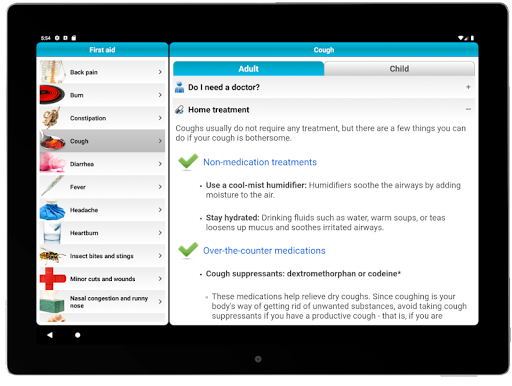 - Use the First Aid Kit for health tips on minor ailments, such as fever, strain, insect bites, etc.