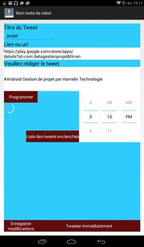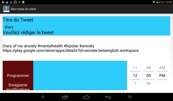 Avec cette application, vous pourrez programmer des tweets a différents moments de la journée! Et biensûr garder en mémoire les tweets ayant besoins d'être tweeter un autre fois!