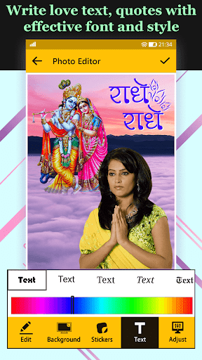 My Photo with Gods app offers instant click executions and maintains the image quality throughout the editing process to serve its purpose effectively and efficiently. My Photo with Gods app presents a wide range of editing features like text, stickers, splash, echo, blur, filter effects, etc.
