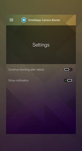 A straight forward settings menu gives the user an option to set up for the camera blocker to resume on reboot, turn notifications on/off and more.