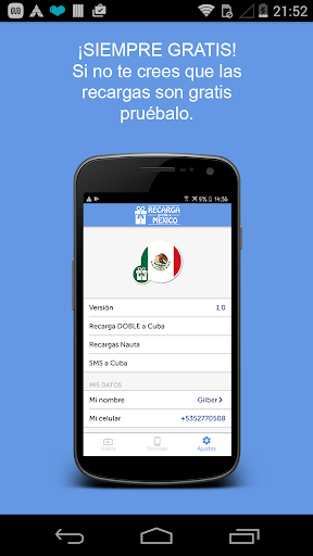 • Esta aplicación de RECARGAS GRATUITAS a México tiene la garantía de https://www.recargadobleacuba.com, http://www.recargasnauta.com, http://www.recargasgratisacuba.com y http://www.smsgratisdesdecuba.com, las mejores apps en RECARGA DOBLE a Cuba, RECARGAS GRATIS a Cuba, RECARGAS Nauta y envío de SMS GRATIS a Cuba. Si no estás convencido, pruébalas y verás lo fácil que es recargar con nosotros, sin costos de procesamiento y sin registrarte: