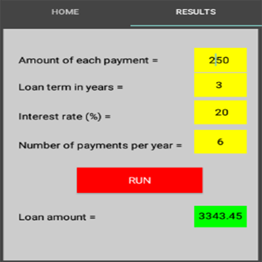 This application is intended to calculate the loan amount. We must indicate the loan term in years, the amount of each regular payment, the annual number of payments and the interest rate.