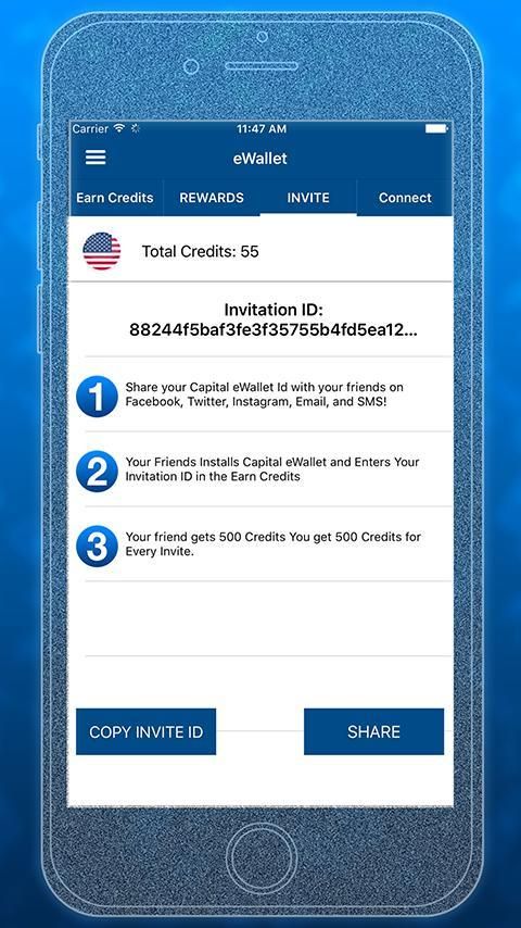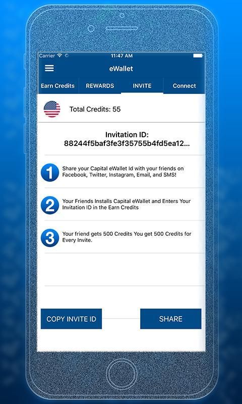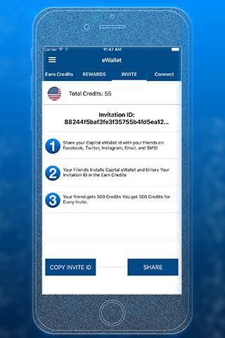 Invite Your Friends to Capital Wallet and earn even more! Every user is given a Capital Wallet ID that you can share using Facebook, Twitter, Google+, Instagram, SMS, Email, or Word of Mouth! Once your Friend Downloads our app they will be prompted to enter your Capital Wallet App ID so you can earn unlimited Recharge for Your Wallet!