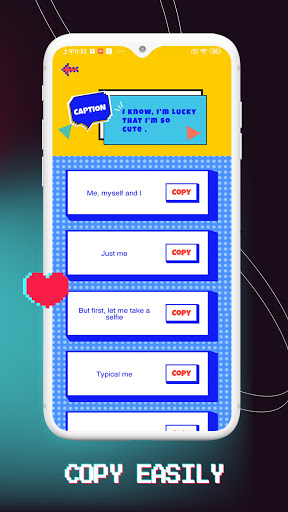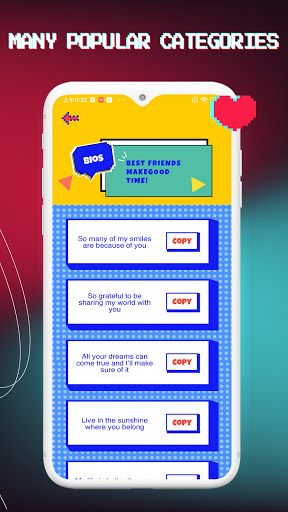 The right caption is just a quick search away. Browse categories or look for the keywords that best suit your niche.Copy and Share captions directly into any social media accounts.
