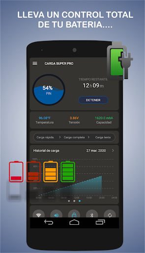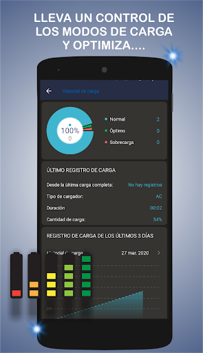 Lleva un registro de la carga que recibe tu dispositivo y así poder sacar mejor rendimiento de la carga que recibe tu teléfono, este monitoreo lleva horas y fechas exactas en que tu teléfono esta recibiendo carga y de esta forma saber cuando haces demasiadas cargas en tu día.