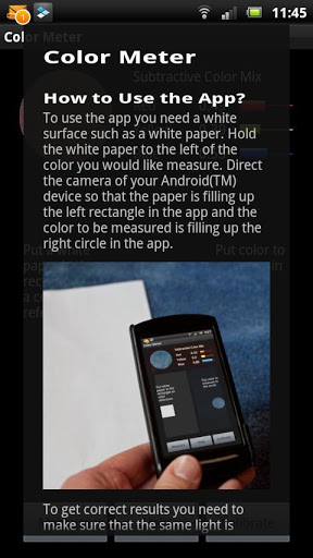 To use the app you need a white surface such as a white paper. Hold the white paper to the left of the color you would like measure. Direct the camera of your Android(TM) device so that the paper is filling up the left rectangle in the app and the color to be measured is filling up the right circle in the app.