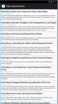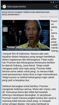 dimana saja dan kapan saja melalui perangkat Android Anda. Aplikasi 100% Kisah Nyata menampilkan artikel-artikel terbaru yang setiap harinya di update. Artikel yang sudah pernah dibaca akan di unduh/download dan tersimpan dalam memori gadget Anda sehingga jika anda ingin membaca artikel tersebut, anda tidak perlu menggunakan koneksi internet.