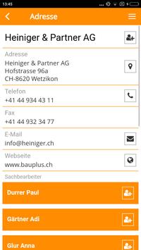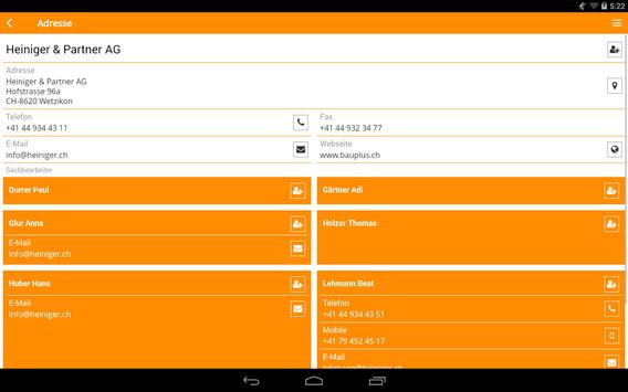 Sie haben Zugriff auf Projektinformationen sowie auf Adressen, Telefonnummern, Emailadressen, usw. der Partner Ihrer Projekte. Sie telefonieren oder suchen Adressen direkt ab BauPlus Mobile mit den Funktionen Ihres mobilen Gerätes.