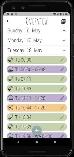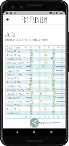 Your child’s habits are pinpointed in a clean and easy to read PDF, that can be printed or shared with your pediatrician or caregiver through mail or chat apps. In addition, it shows daily stats for sleeping and crying durations, and meals.