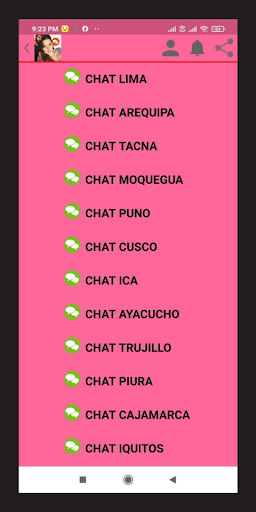 Dengan Chat Peru akan bertemu orang dari Lima, Cañete, Tacna, Ica, Chiclayo, Piura, Cuzco, Cajamarca, Nazca, Ilo , Moquegua, Trujillo, Chincha, iquitos di kalangan wilayah lain dari Peru.