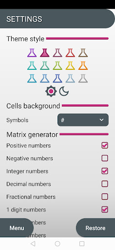 It also includes a matrix generator with random numbers: integer, decimal, positive and negative numbers.