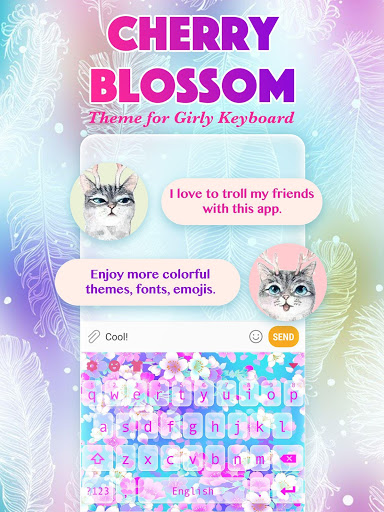 ❤ Cherry Blossom Keyboard Theme for Girls ❤ is a free app that is perfect for you and your friends, and you won't be able to resist its sweet cuteness. You will never wish to let your phone go because of our "Cherry Blossom Keyboard Theme for Girls", and when you do, this colorful keyboard will be there waiting for your next touch. Enjoy!