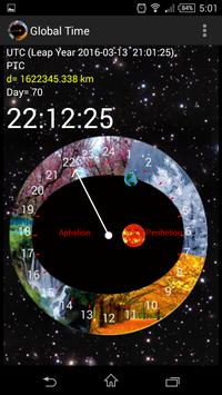 Global Time application indicates the condition of the earth with respect to the the sun in the polar system as well as the distance (d) between the earth and the sun and what season earth is inserted. Day is supposed for the number of days that earth has passed since perihelion in its orbit. This time is unique all over the world.