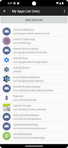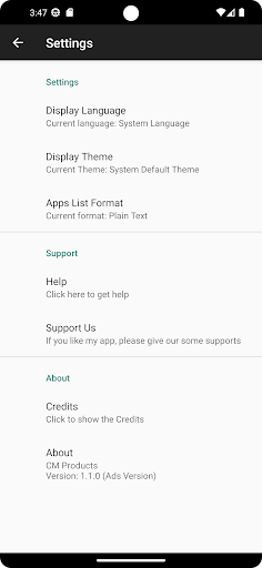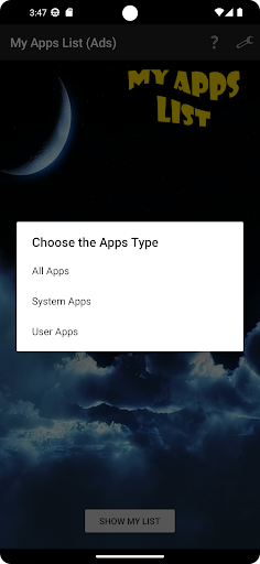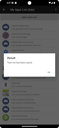 If you have used the Android system for some time, it is time to show your application list to the others. If you are new to Android, you should introduce this app to your friends and get their apps list to see what apps you are missing. Just press "Show my Apps List" button to show your Apps List, and then select the apps you would like to show on the list and press "Save your list" button to get your list, the lists are saved to your SD Card, inside "My Apps List" folder. You might set the Apps List Folder storage location and Apps List Format (Only Available in Paid Version) in Setting.