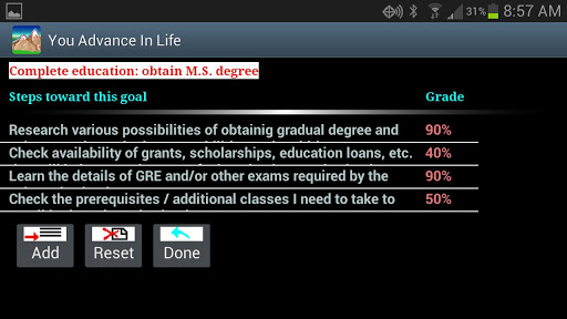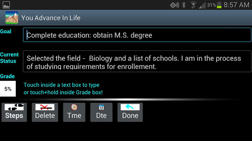 This app helps you keep the list of descriptions of your goals that you can easily scroll up and down for quick review. A simple tap on any goal opens its description for viewing or editing its text, optional current status and optional self-grading. You can optionally set up a date/time for automatic reminding about the selected goal. You can also maintain the list of steps toward each selected goal.